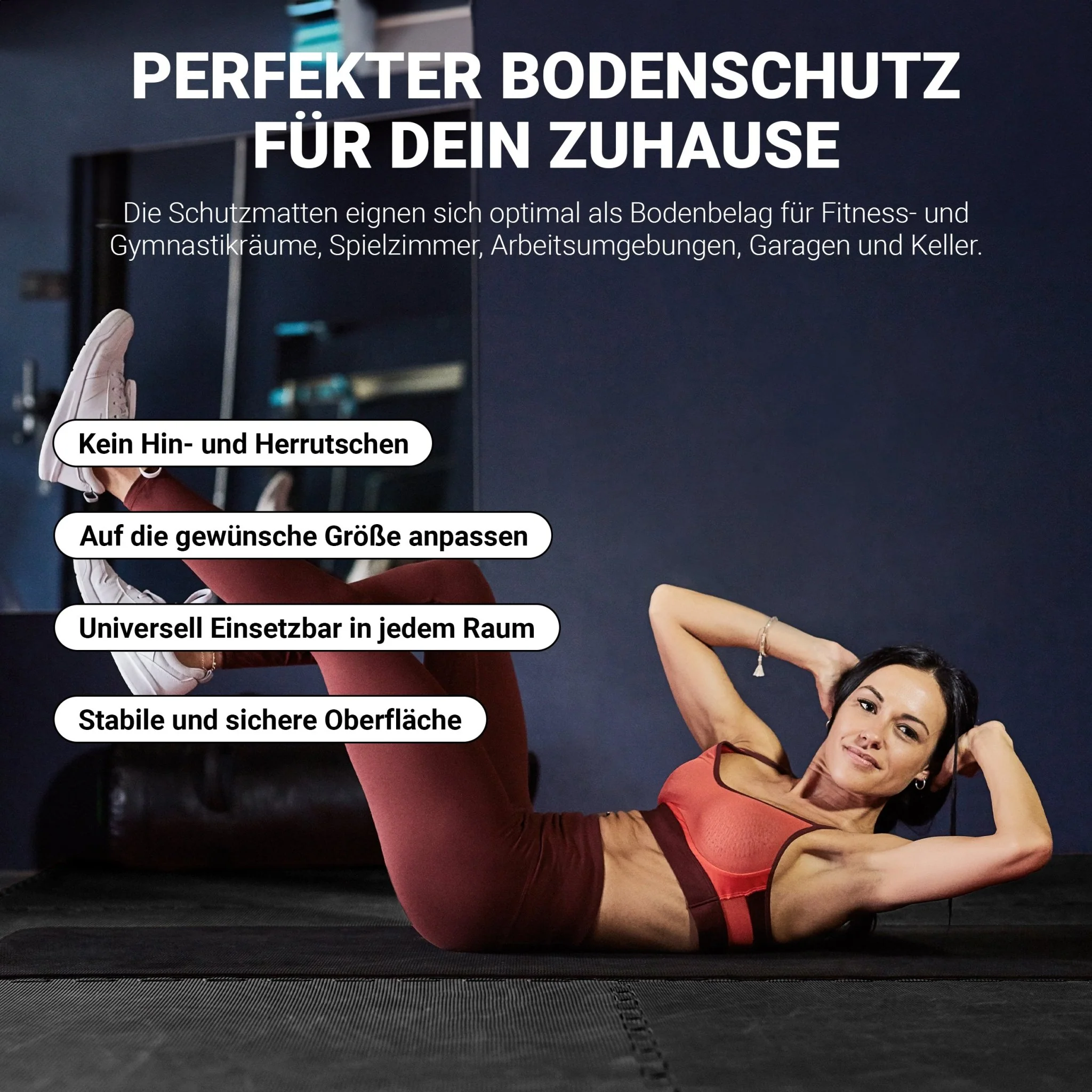Schütze Deinen Boden und sorge für sicheren Halt – mit robusten Bodenschutzmatten für Dein Heimtraining und Deine Sportgeräte.