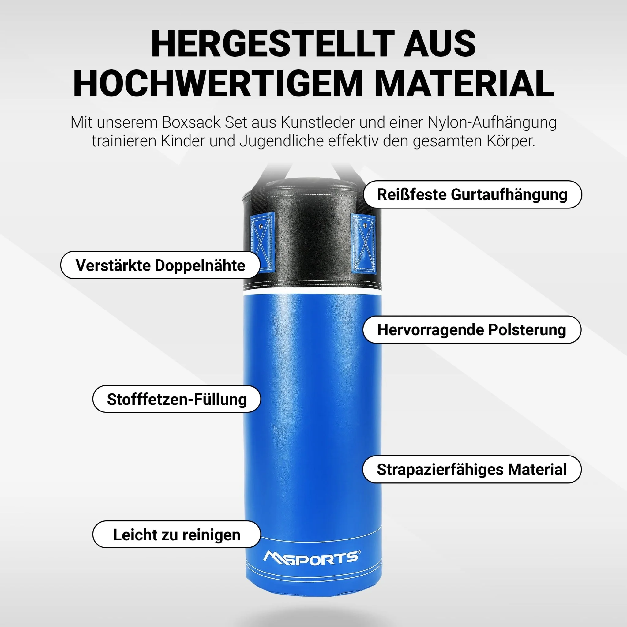 Mit diesem Boxsack Set aus Kunstleder und einer Nylon-Aufhängung trainieren Kinder und Jugendliche effektiv den gesamten Körper.